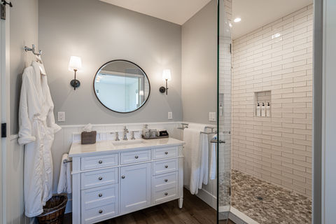 This property offers nine double rooms for players and the large Hayloft Suite. The Hayloft measures 1000 square feet with three sleeping bays and a pull-out sofa and is ideal for visiting VIPs or tennis teams. The nine cottage rooms are approximately 380 square feet each and can be configured as double queens or king beds with pullout sofas.